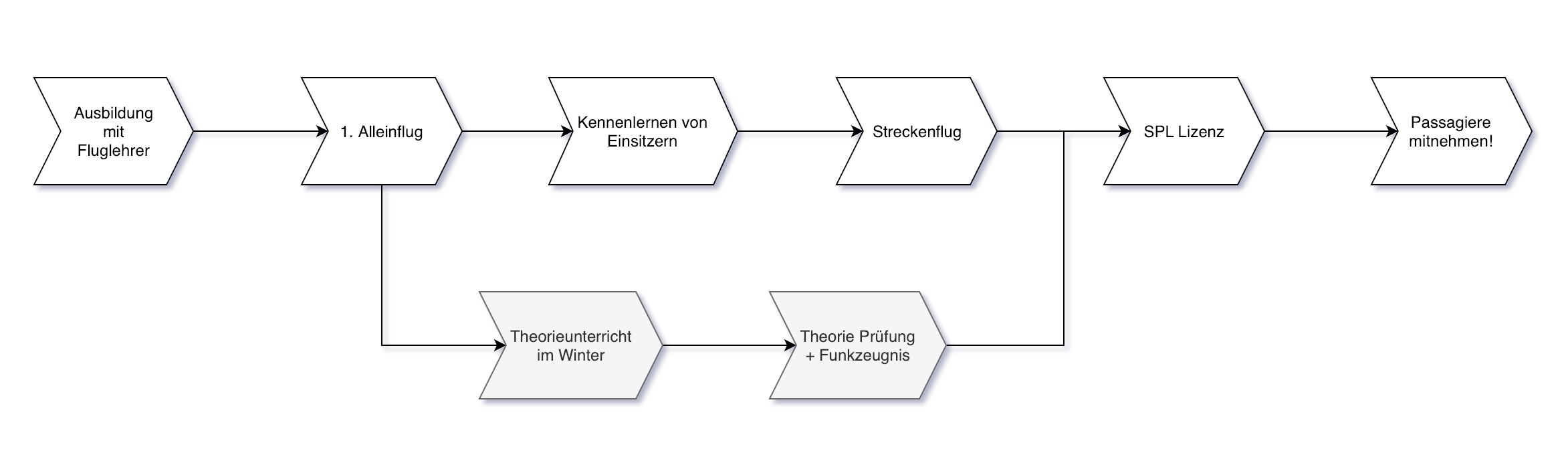 Zunächst lernt man mit unseren ehrenamtlichen Fluglehrer den Start an der Winde, Kurven fliegen, Landen und vieles mehr.